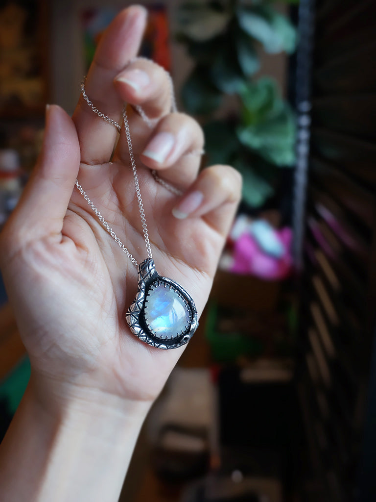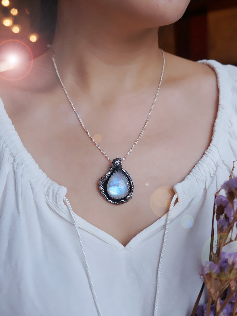 象徵財富與智慧的錢蛇環繞著一顆靈光閃耀的藍暈月光石。月光石在光線中折射出如夢似幻的藍白光澤,宛如夜空中的靜月,柔和而神秘。