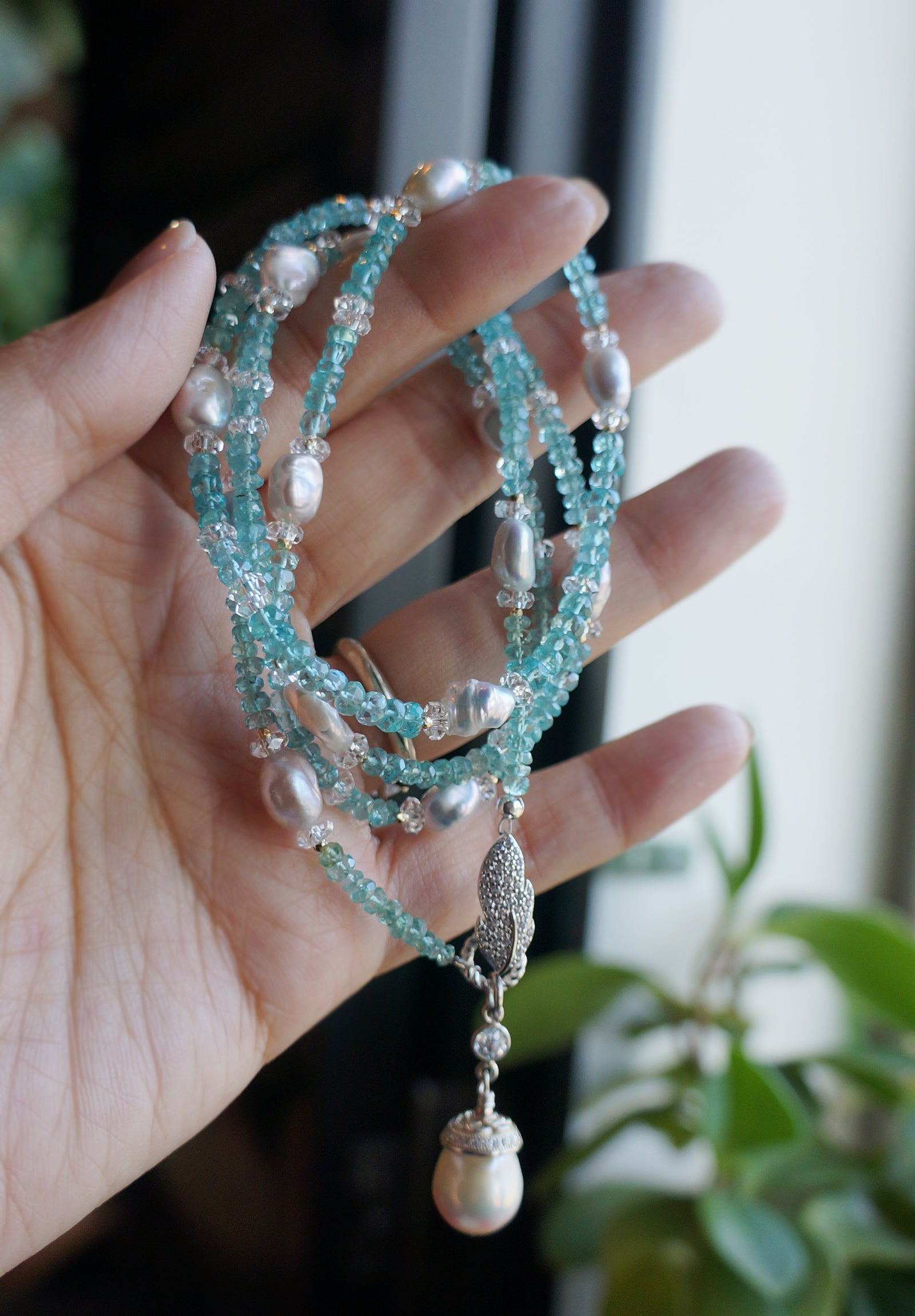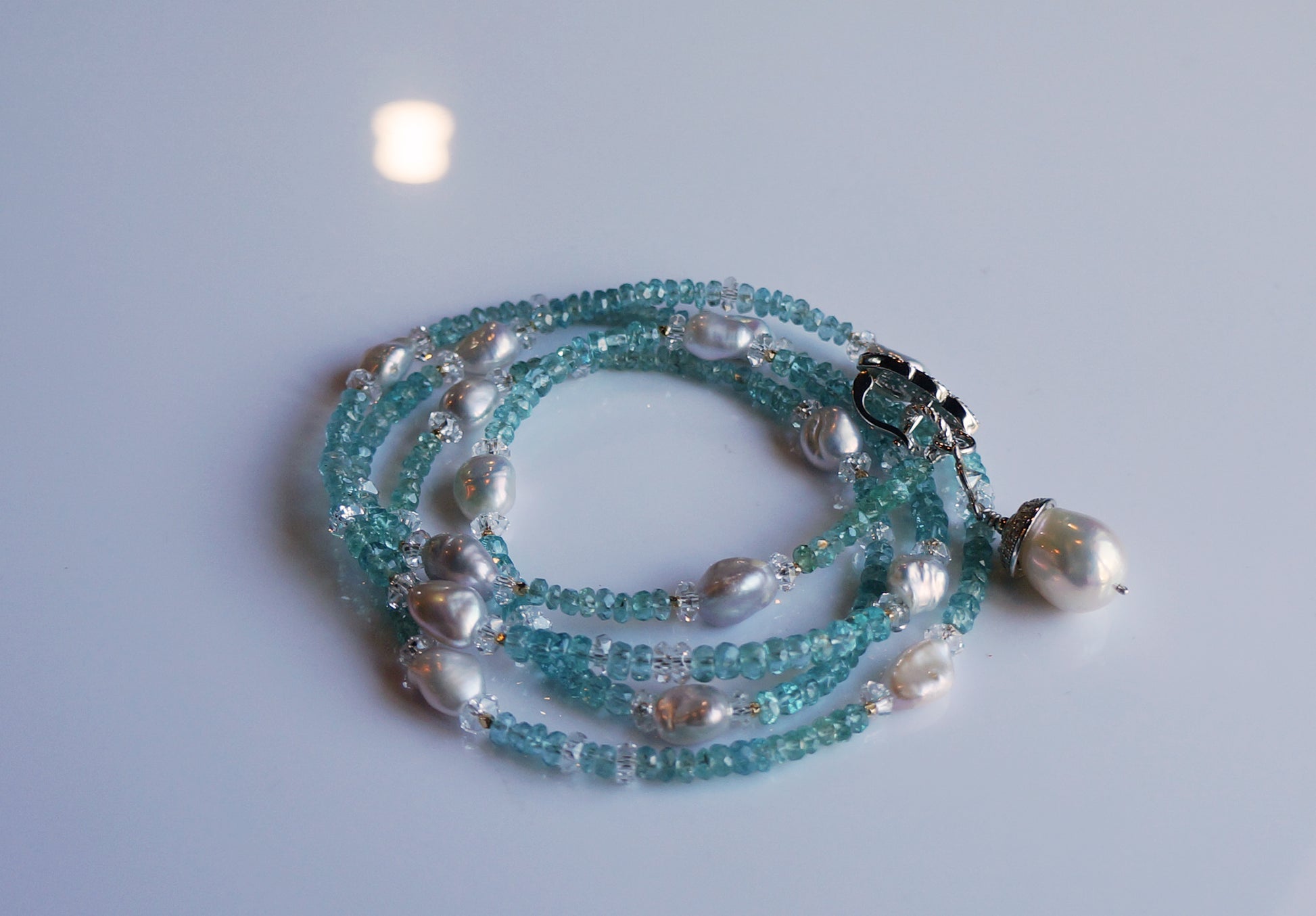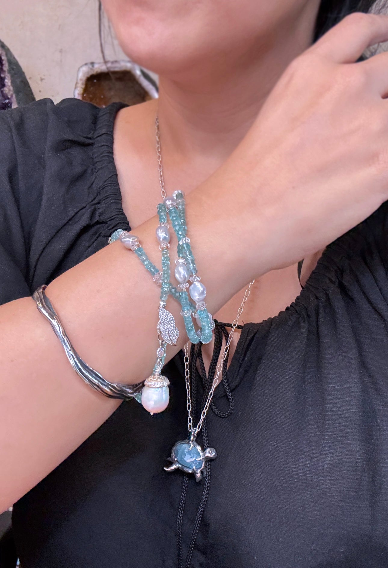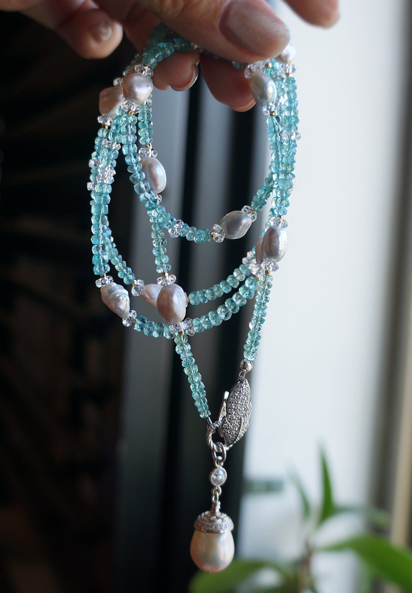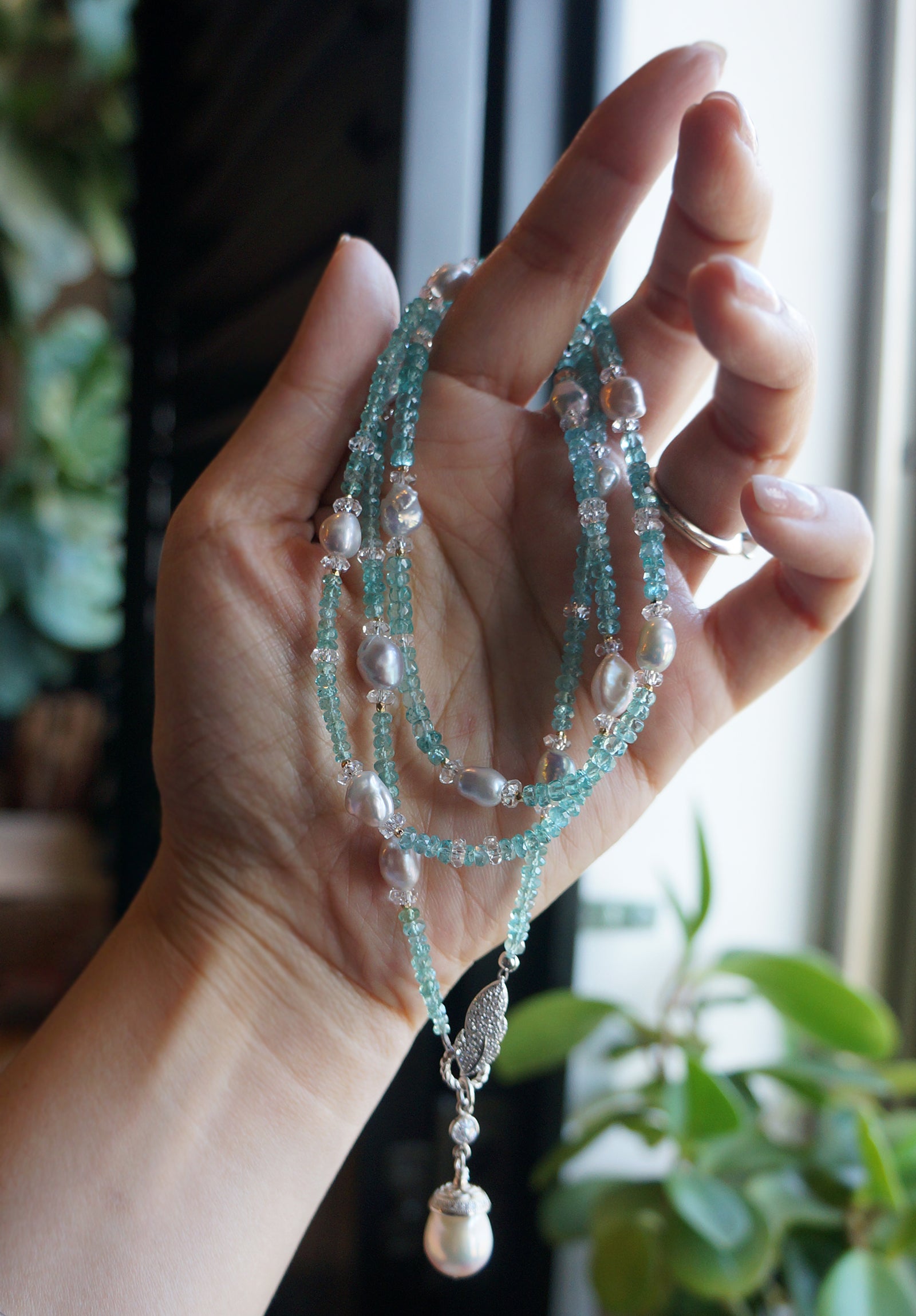 清爽的天空藍磷輝石加上典雅的珍珠,是一條讓人看著相當舒心的色調~
